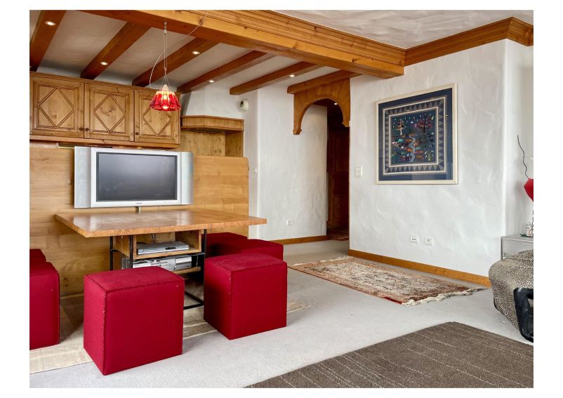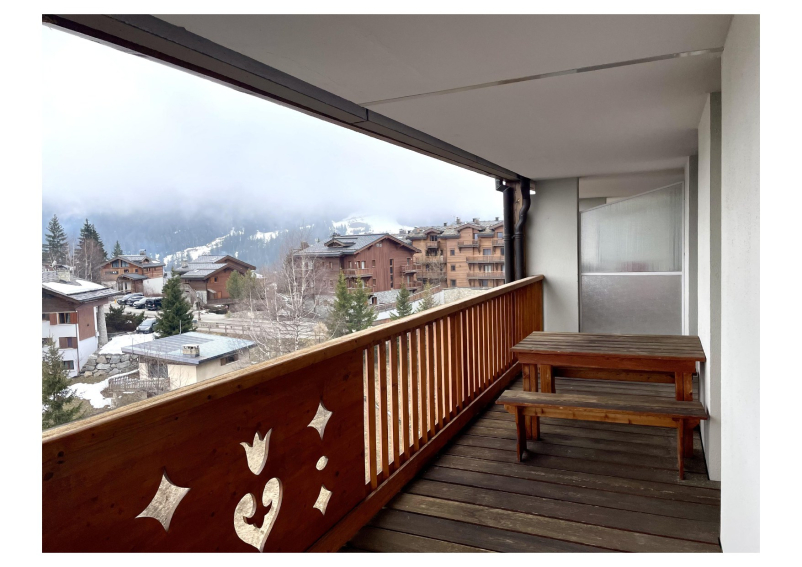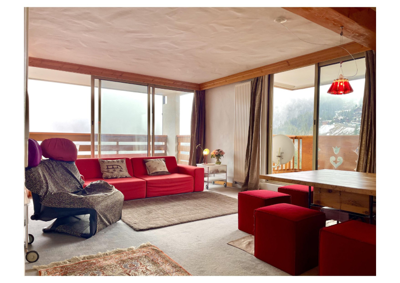Living room with dining area and northeast-facing balcony with mountain views (Dent du Villard).