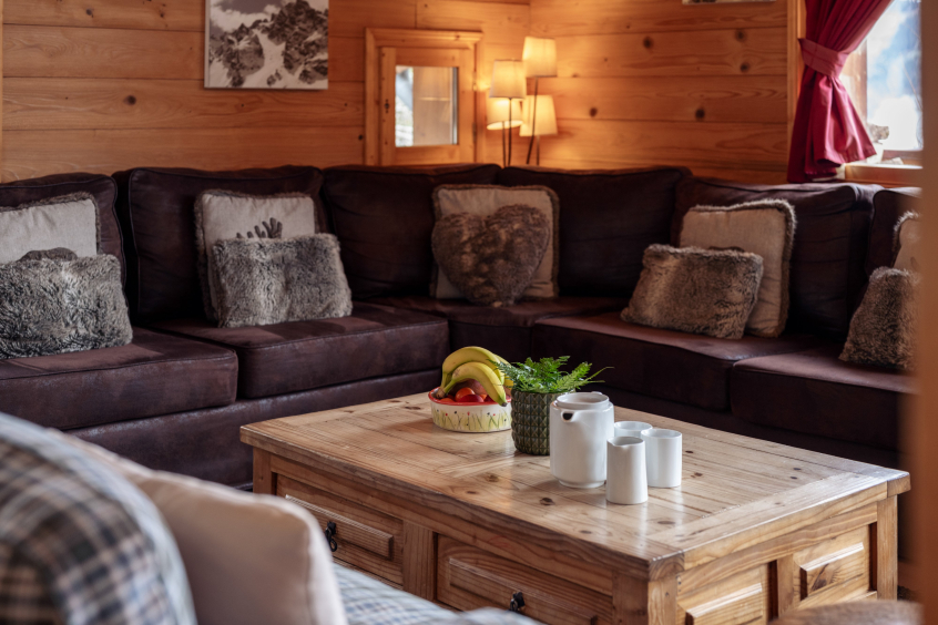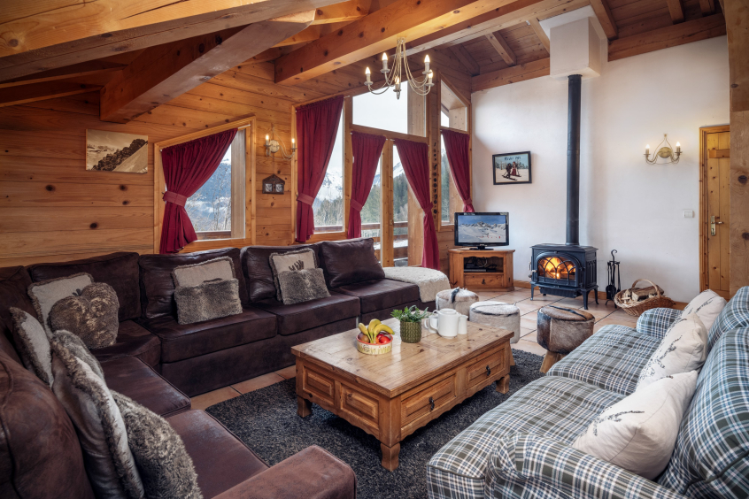 Le salon à double hauteur possède d'énormes fenêtres, offrant ainsi beaucoup de lumière et d'espace ainsi que des vues imprenables. Décoré avec des canapés invitants (neufs en 2022), des coussins en fourrure et un décor vintage savoyard, le chalet dégage une ambiance chaleureuse et confortable.