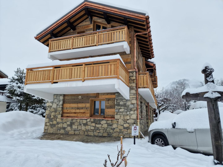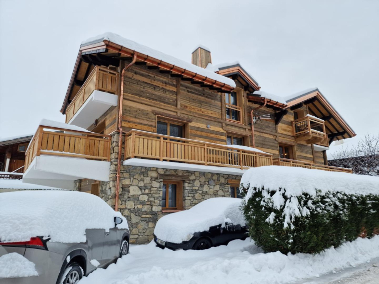 Au-delà du cœur village, l’allée des Cerisiers mène au chalet Kodiak – terrasses plein soleil face aux pistes.