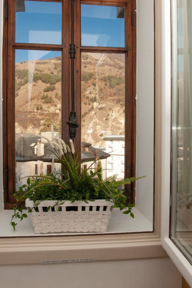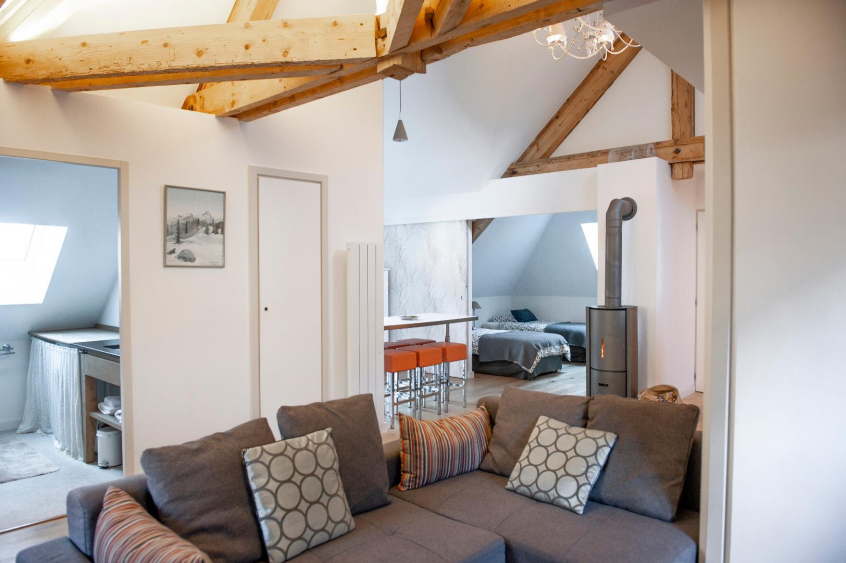 Lumineux appartement sous les toits pour 4 personnes avec balcon et vue dégagée sur les montagnes de la Vanoise et sur la piscine et jardin!