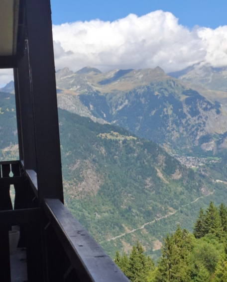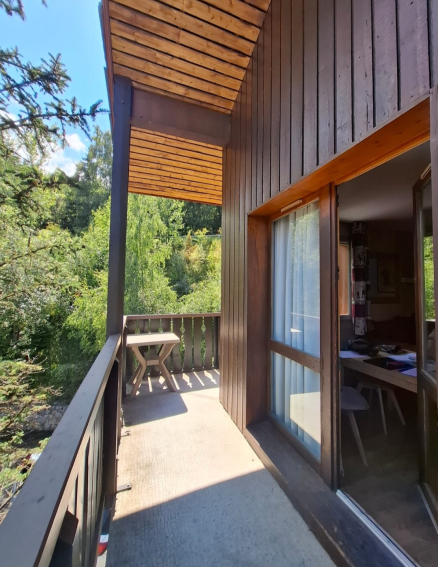 Pièce à vivre agréable donnant sur un balcon exposé ouest avec jolie vue sur la vallée, la montagne et la foret avec un canapé lit gigogne et télévision.
